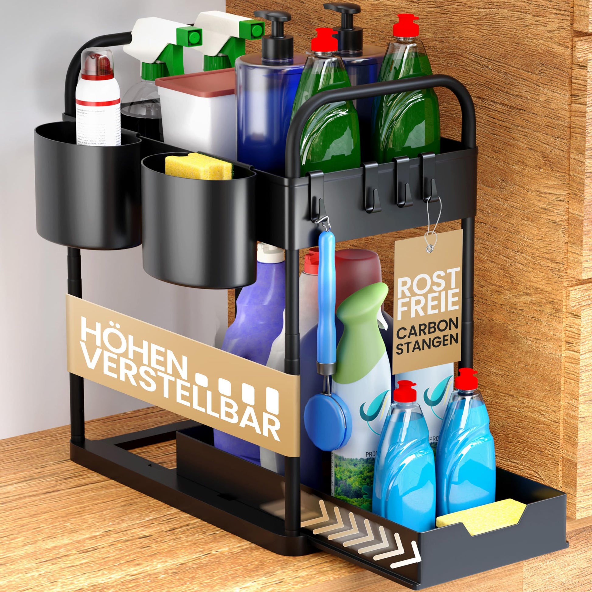 - [LANGLEBIGE QUALITÄT] - Vertraue auf die robuste Bauweise unseres Waschbecken Organizers. Die gebürsteten, rostfreien Carbonstangen (Ablagefächer aus Festkunststoff) garantieren eine lange Lebensdauer und machen ihn zu einem langlebigen Helfer in Küche & Co.