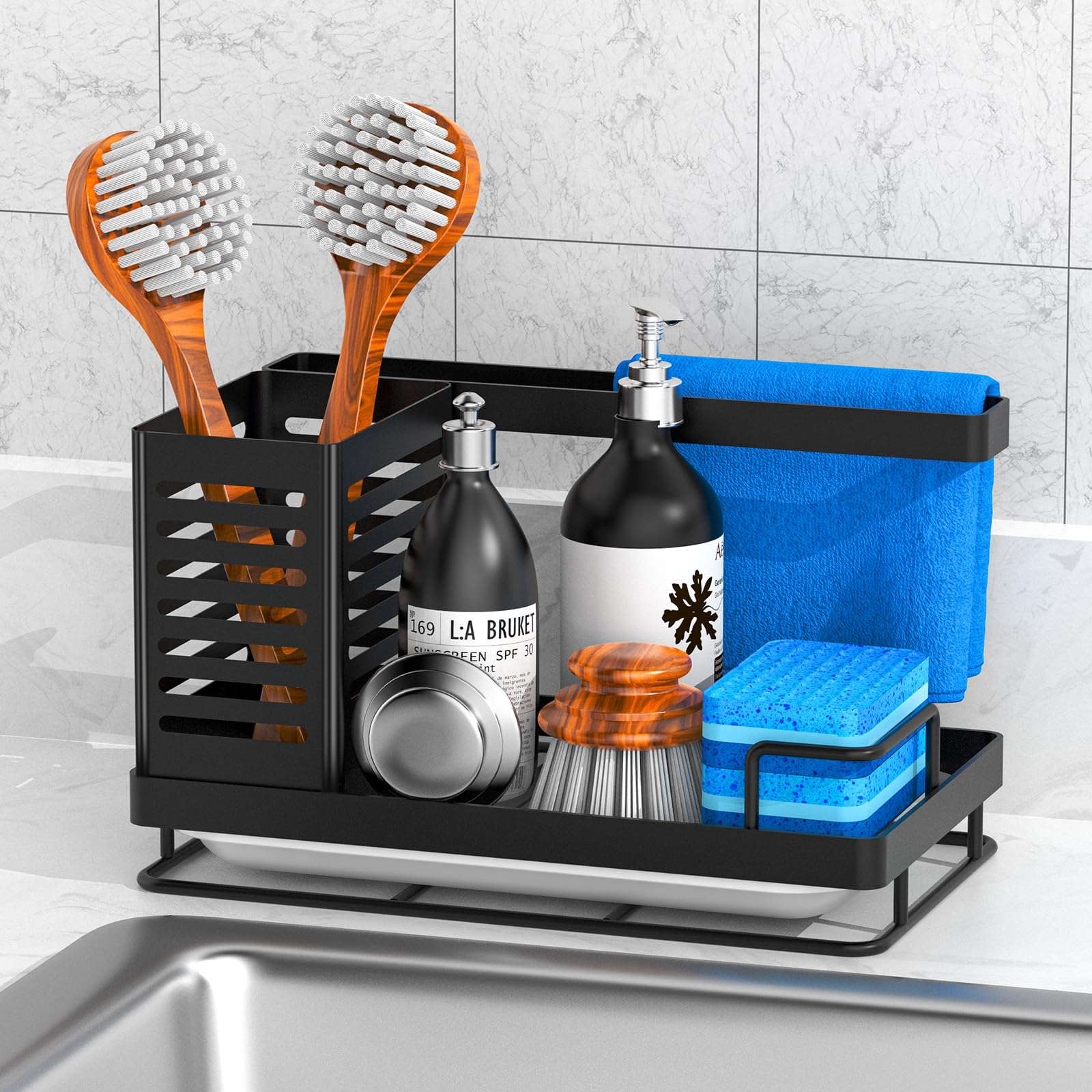 JYSDCXC Spülbecken Organizer mit Abflusspfanne,Küchenspüle Caddy Schwarz,Spülbecken Caddy für Schwämme/Bürsten/Seifen in Küche und Bad,Rutschfest,abnehmbar